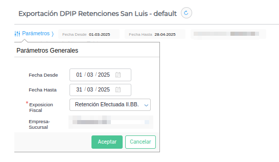 Ingresas a través de Menú → Gestion Empresarial → Impuestos → Aplicativos → Exportación DPIP Retenciones San Luis