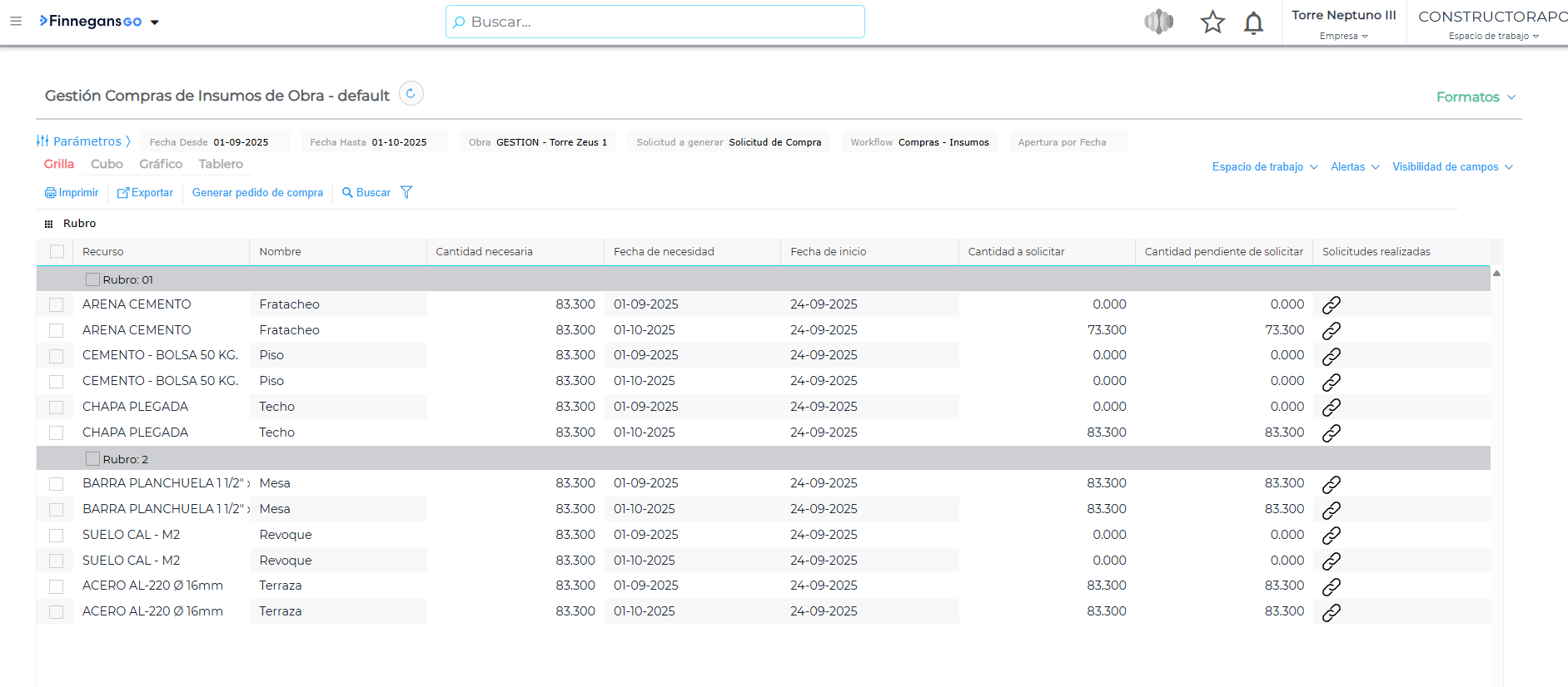- Crea una Solicitud de Compra que agrupa todos los recursos de los ítems de un mismo rubro.