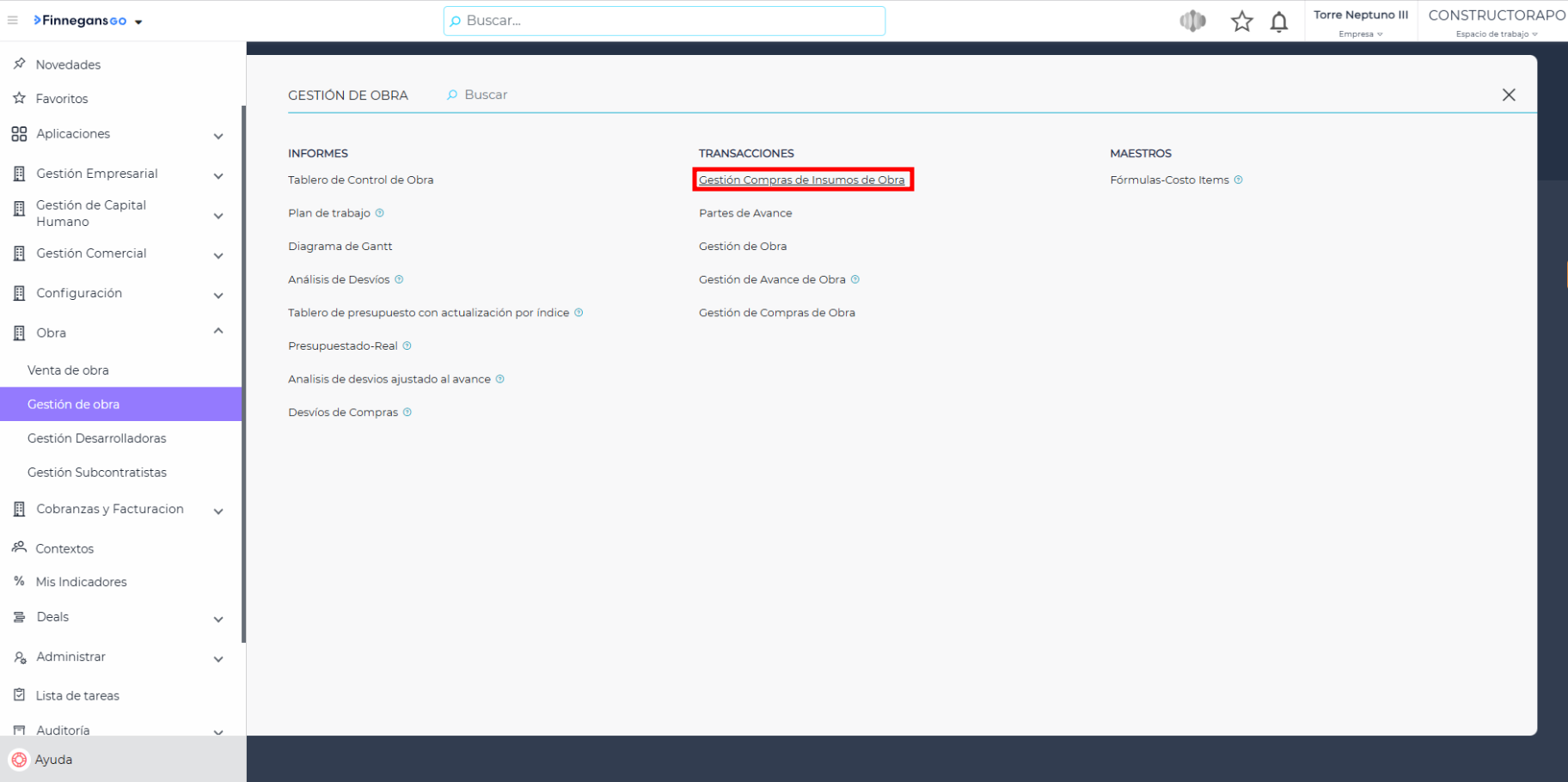 Menú > Obra > Gestión de Obra > Transacciones > Gestión Compras de Insumos de Obra