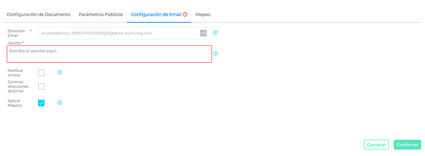 El campo “Asunto” se debe completar con el Asunto de los correos que enviamos con las planillas xls de las exportaciones de echeqs que proveen los bancos. Este valor debe ser único e intuitivo para los usuarios que vayan a utilizar la herramienta.