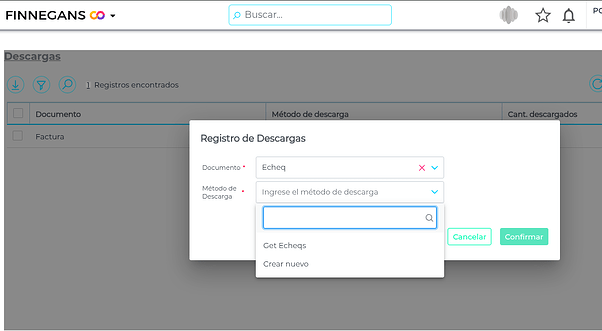 3- Se muestra un POP UP que solicita “Documento” y “Método de Descarga”. En el selector de Documento, buscamos el valor “Echeq”.