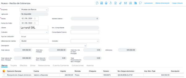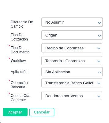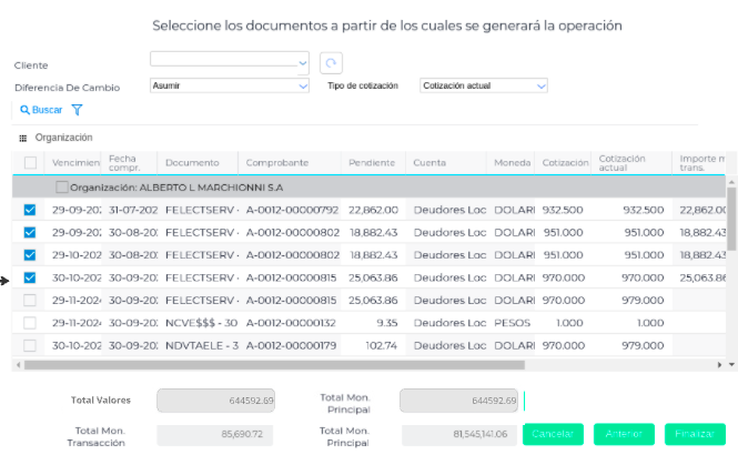 Las cobranzas se precargan con los valores seleccionados en la solapa banco, las facturas en la solapa Cta Cte y en cabecera el cliente y el tipo de diferencia de cambio.