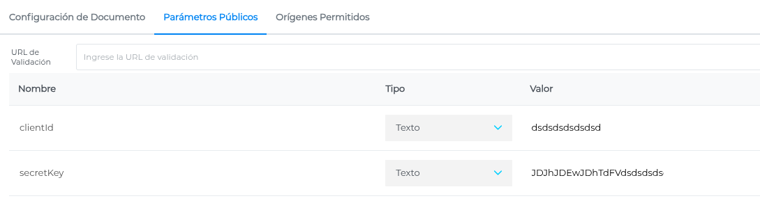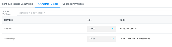 En la solapa “Parámetros Públicos”, completamos los campos clientId y secretKey con las credenciales de un usuario del ERP.
