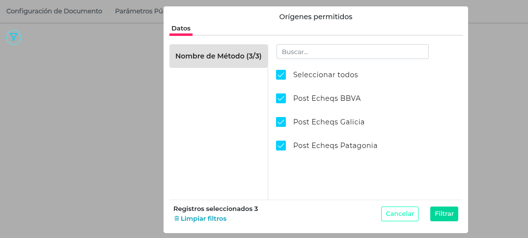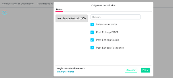 En la solapa “Orígenes Permitidos”, vamos a hacer check en el campo “Seleccionar todos” y presionamos el botón “Filtrar”.