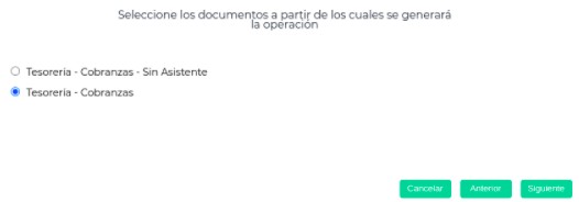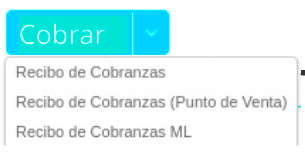 Si todos los valores seleccionados corresponden a un mismo cliente, se despliega desde el botón “Cobrar” un combo con los documentos de categoría “Cobranza”, tal cual se ve al presionar “Nuevo” en la grilla de Cobranzas.