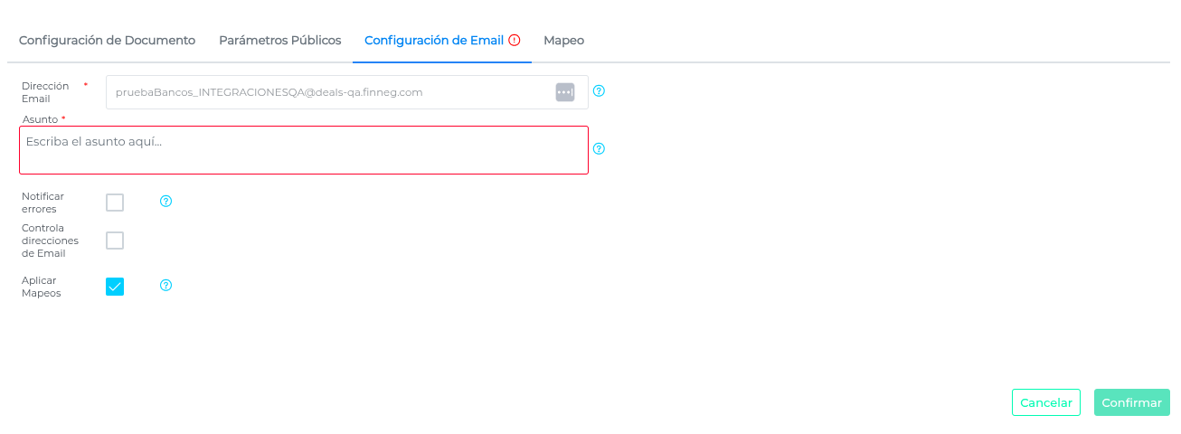El campo requerido es “Asunto”. El campo “Dirección Email” ĺo provee el sistema y es único para cada empresa, y no es editable.