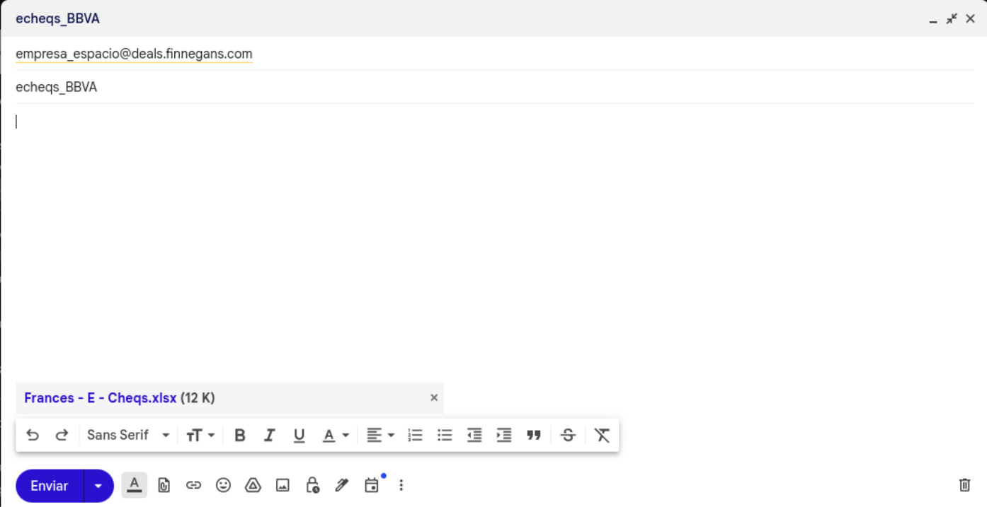 Los usuarios sólo deberán descargar de los HomeBanking de los respectivos bancos un archivo excel con los Echeqs que están en estado “Aceptado”, y luego los envían por mail como un adjunto a la cuenta de mail suministrada por DEALS, respetando el Asunto que se definió en la configuración. (Nota: En este caso vamos a usar el Asunto “echeq_BBVA”.)