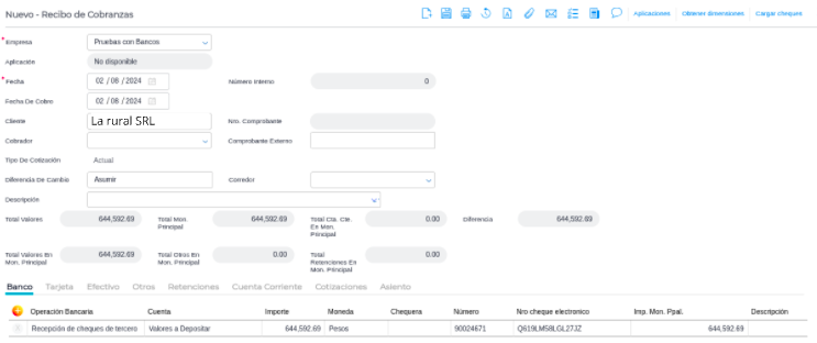 Al Finalizar el Asistente, se muestra un documento de cobranza con la cabecera identificando al Cliente, con todos los valores seleccionados completando los ítems de la solapa Banco y con las facturas seleccionadas en el asistente completando la solapa de cuenta corriente. Se aplican todos los controles de integridad que normalmente se hacen en la carga de una cobranza de forma manual. Si cumple con los controles, se permite guardar el documento y volver a la grilla de echeqs.
