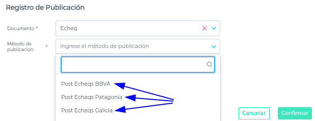 - Se muestra un POP UP que solicita “Documento” y “Método de Publicación”. En el selector de Documento, buscamos el valor “Echeq”.