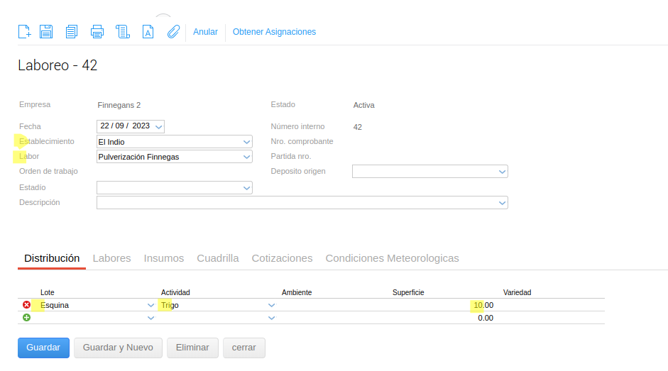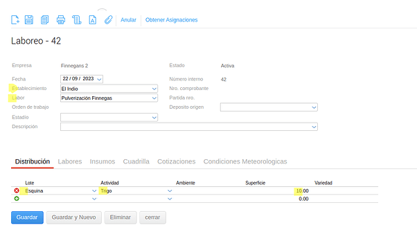 Da de alta laboreos normalmente para los establecimientos y lotes relacionados entre Finnegans y Cropwise