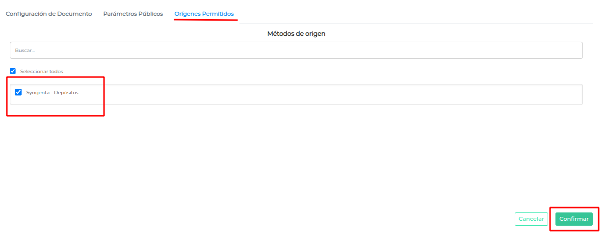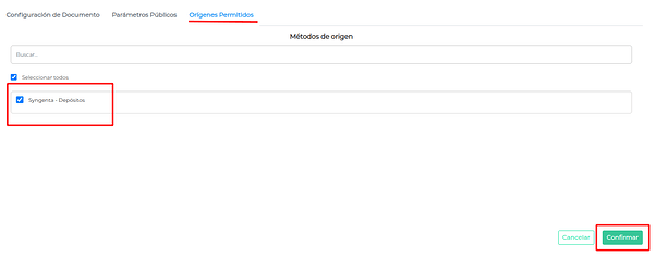 - Ir a la solapa “Orígenes Permitidos” y activar el check para “Syngenta - Depósitos”. Por último, presionar en el botón Confirmar.