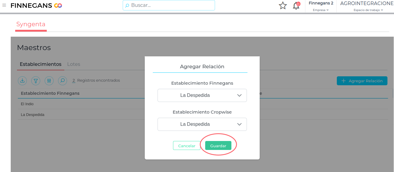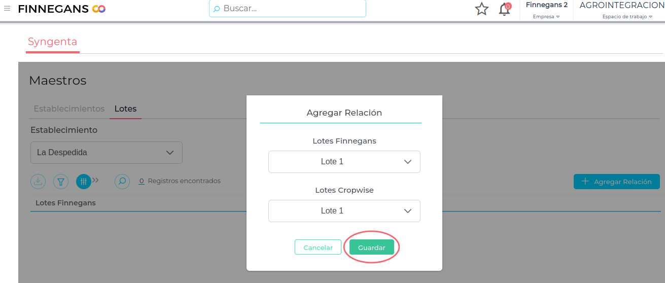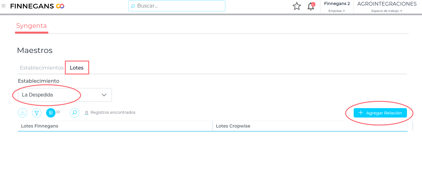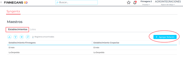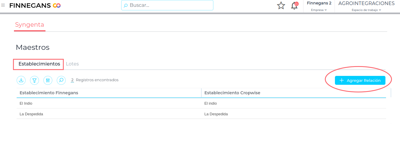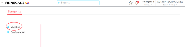 Luego volver a la aplicación de Syngenta e ingresar a la opción de Maestros para relacionar los establecimientos y lotes entre Cropwise y Finnegans: