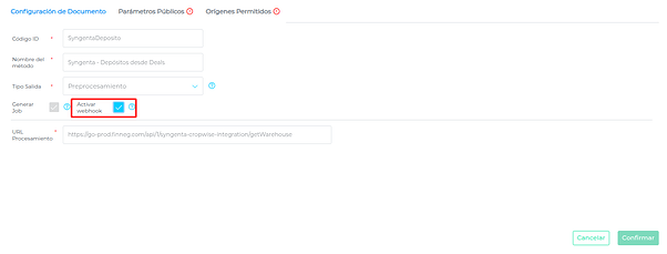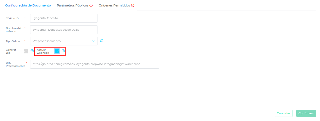 - En la solapa “Configuración de Documento” activar el check para la opción “Activar webhook”, el cual habilitará la solapa “Orígenes Permitidos”