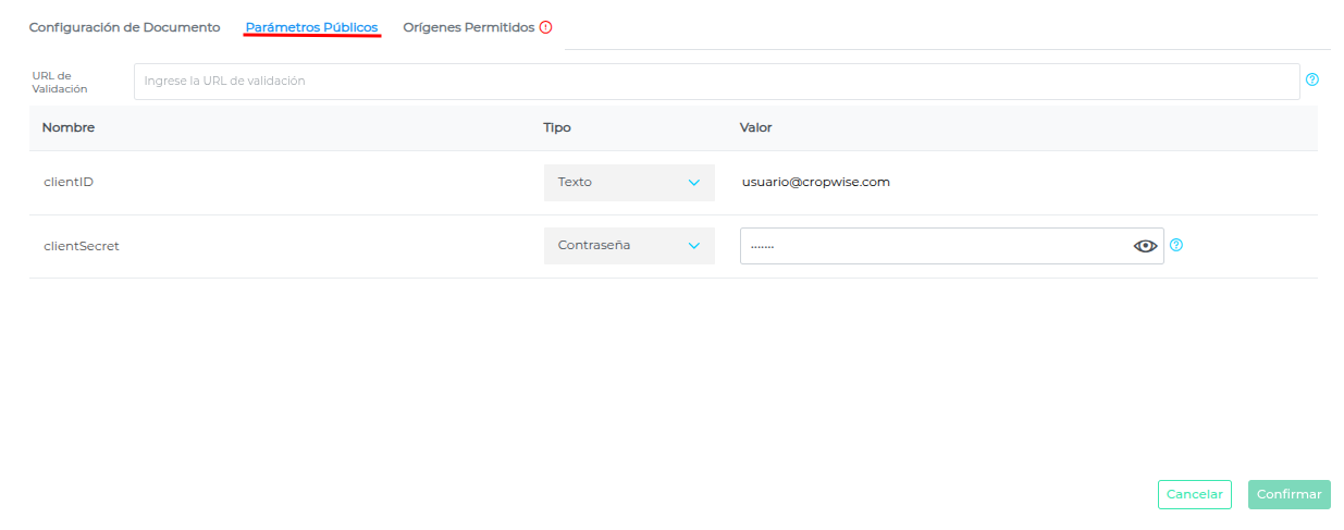 - Ir a la solapa “Parámetros Públicos” y completar el clientID con el email utilizado para loguearse en Cropwise y el clientSecret con la contraseña.