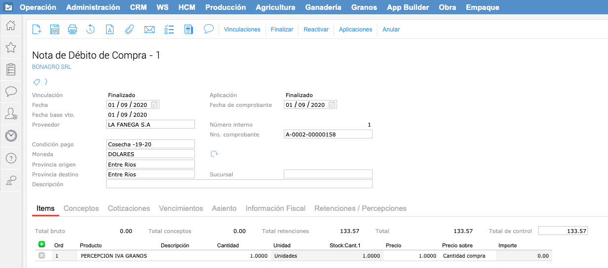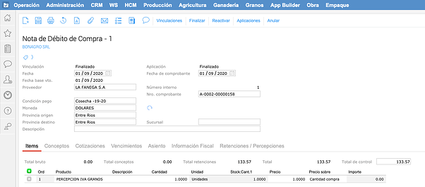 2.1 El proveedor nos emite una nota de débito por el monto de la percepción según la categoría SISA del productor. La misma se da de alta como una nota de débito sin asistente en el sistema con los siguientes parámetros: