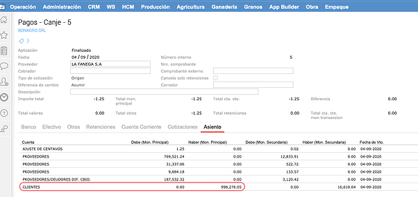 Daremos de alta un documento de “Pagos - Canje” con asistente seleccionado todos los documentos que queremos aplicar entre sí.