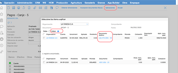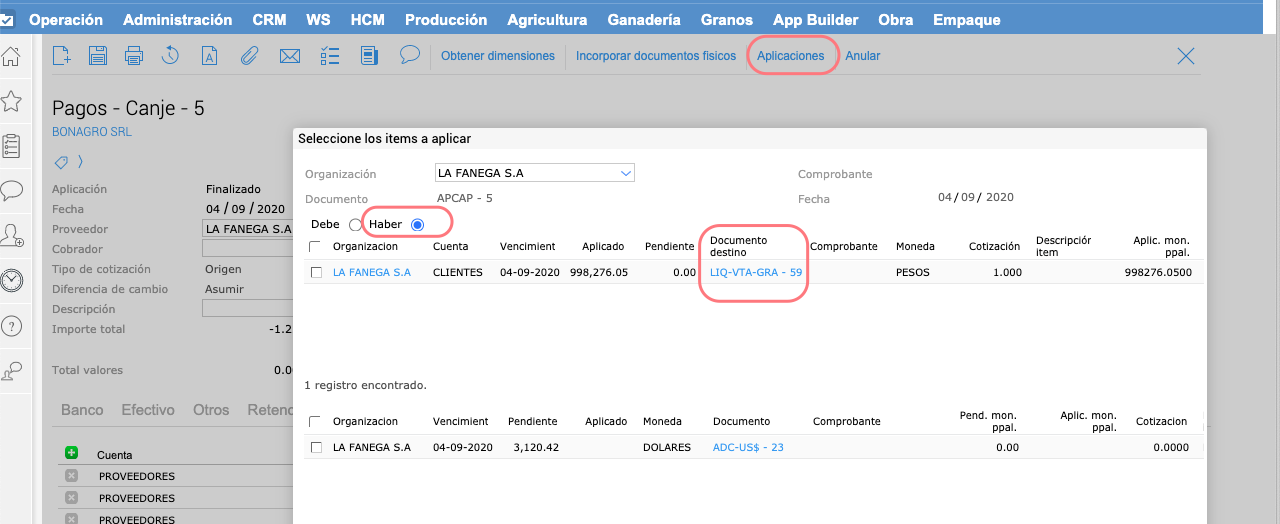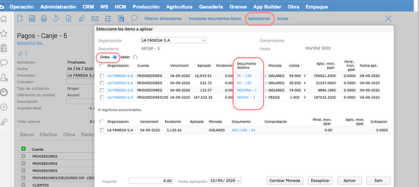 y desde la opción de “Aplicaciones” del documento se pueden detallar los documentos aplicados al debe y al haber.