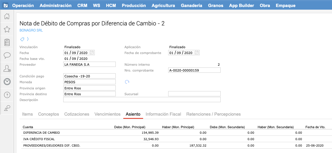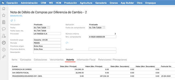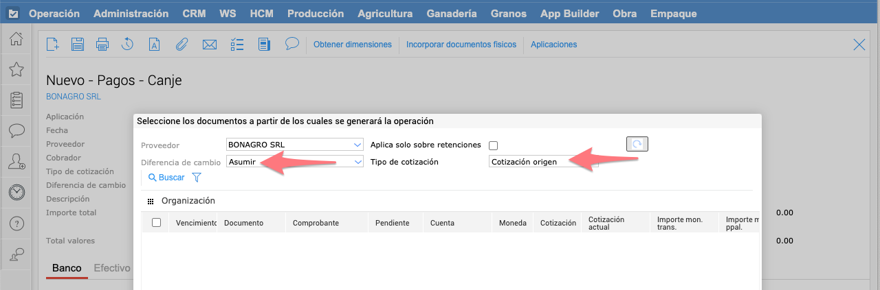 En el asistente filtramos por el proveedor, se define “Asumir” diferencia de cambio y en tipo de cotización “cotización de origen”. Después de esto se seleccionan todos los documentos a aplicar. De esta forma podemos asociar las liquidaciones de granos en pesos con las facturas de compra y ND en dólares.