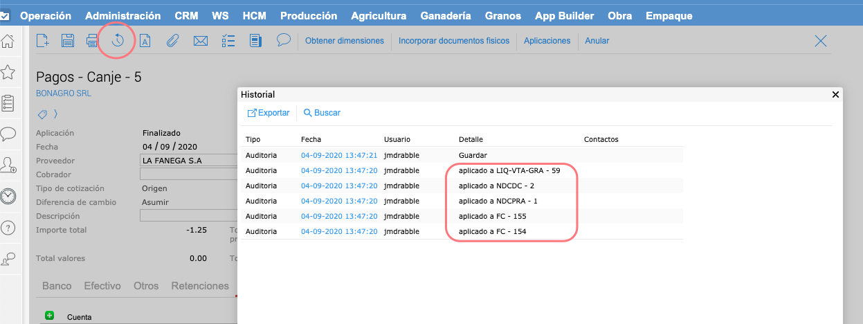 En el historial del documento generado se pueden visualizar los documentos aplicados: