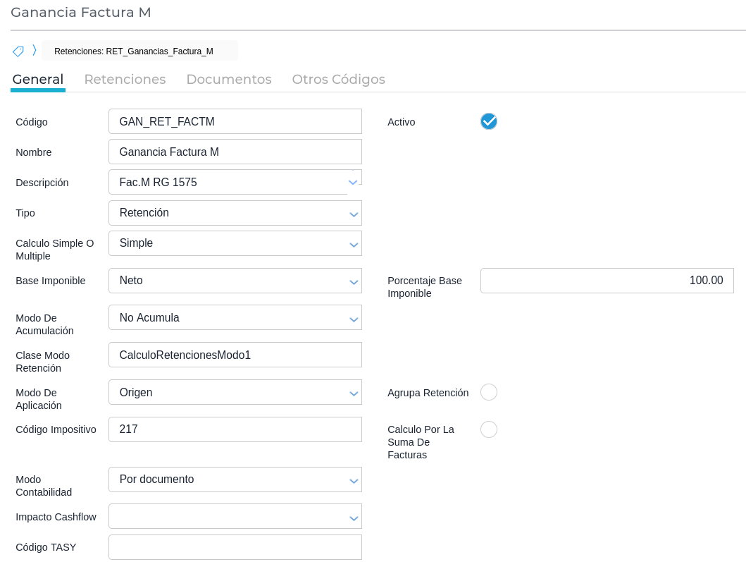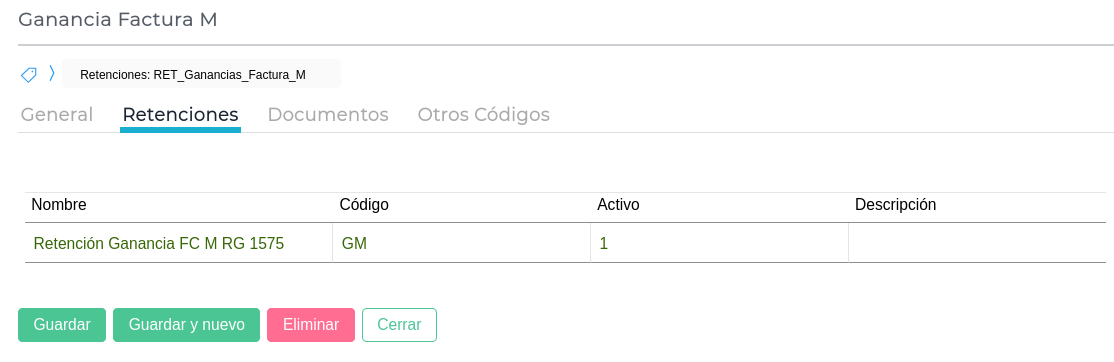El Tipo de Retención “Retención IVA Factura M” se encuentra configurado con base imponible “Según Detalle”; por ende, requiere que se configure la misma junto al Concepto de Retención “Retención IVA Factura M” en los conceptos calculados utilizados en las compras como se indica a continuación: