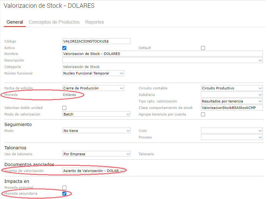 Para valorizar el stock en moneda secundaria no es necesario crear una nueva valorización, ya que en estas empresas se suele utilizar la moneda secundaria “Dólares”.