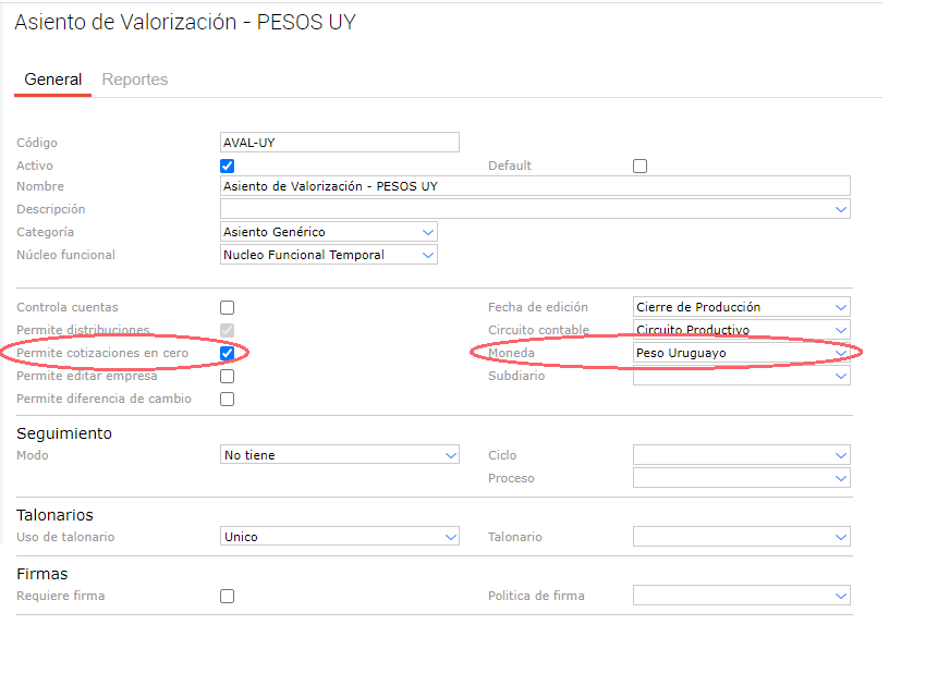 A modo de ejemplo, indicamos las configuraciones a realizar en el caso de que la moneda principal de la empresa sea Pesos Uruguayos.