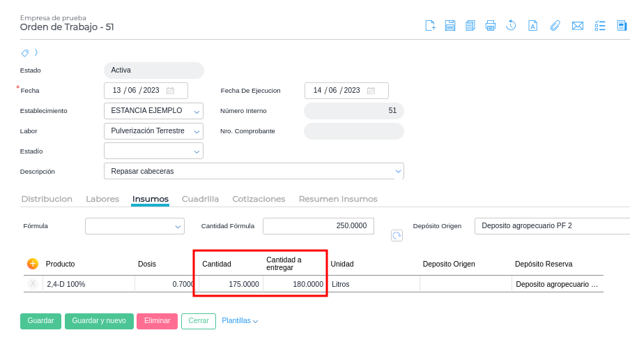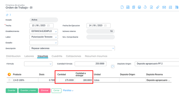 En la siguiente orden de trabajo se definió la cantidad requerida para el laboreo y la cantidad a entregar de insumos, en este caso las cantidades no son coincidentes: