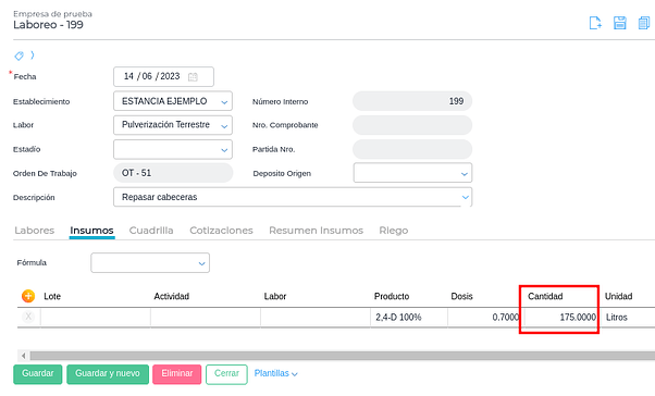 Al dar de alta el laboreo con esta orden de trabajo, las cantidades de insumo que se recuperan son las informadas y necesarias para llevar a cabo el laboreo y no las entregadas. Sin embargo las cantidades o dosis se podrán editar en el laboreo según sea el caso