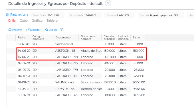 En el siguiente detalle se puede observar el egreso de insumo en el depósito de origen (-180kg) de la orden de trabajo que mueve stock y el ingreso al depósito destino o reserva (180kg), las dos cantidades son las informadas en el campo “cantidad a entregar” de la OT.