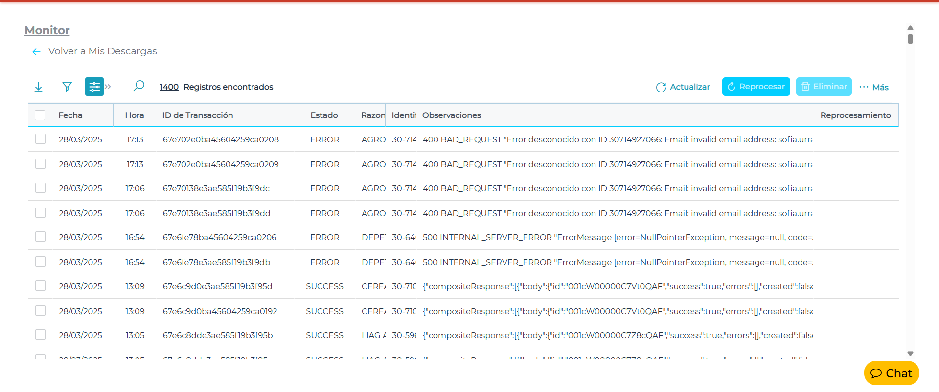 Si el registro quedó con error y no pudo ingresar a Salesforce, se debe visualizar en la columna “Estado” el valor ERROR.