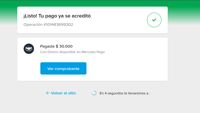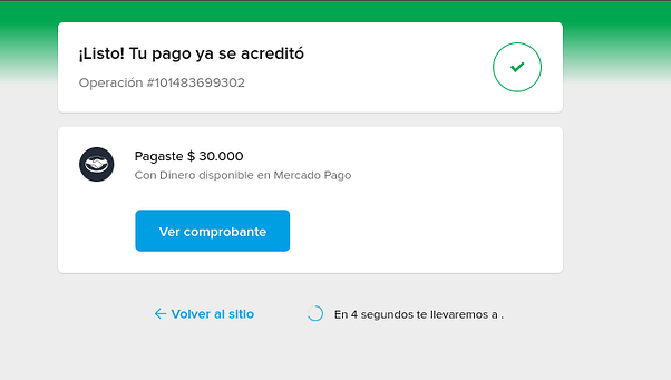 Cuando el mismo finalice, se le informará que el pago fue exitoso y se cerrará la pestaña correspondiente.