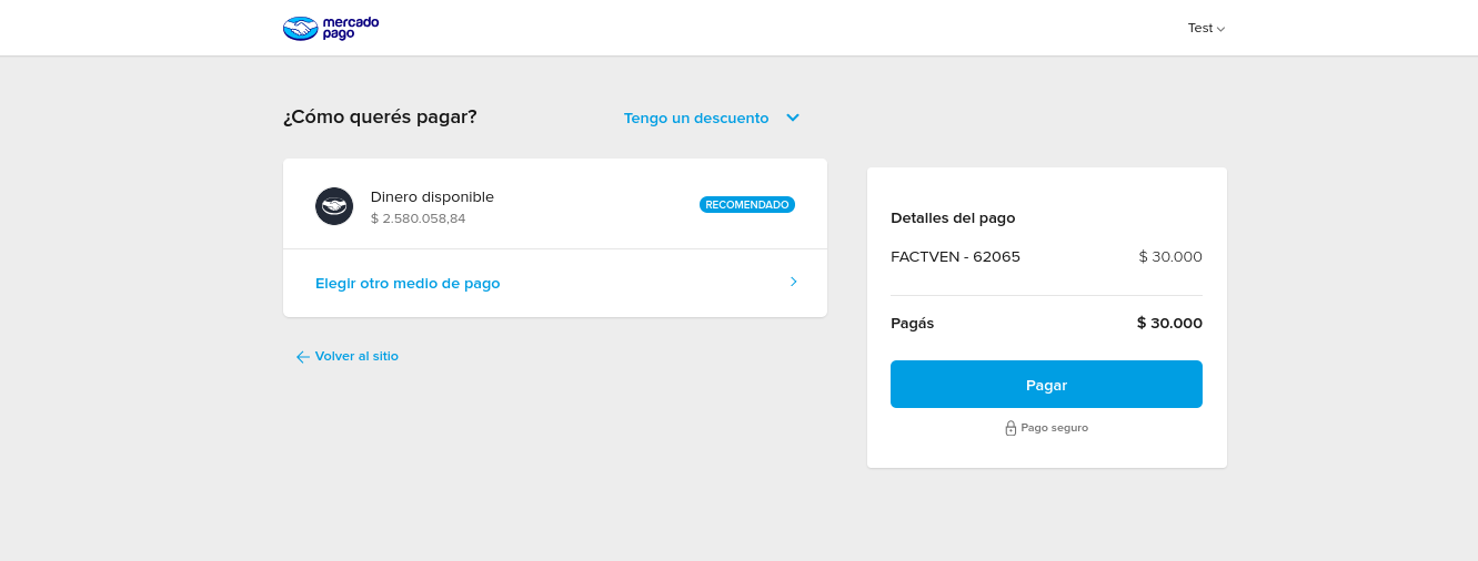 7- Como consecuencia de la acción anterior, se abre automáticamente una nueva pestaña en el navegador, con la página de mercado pago la cual contiene el importe total a pagar en base a las facturas seleccionadas previamente.