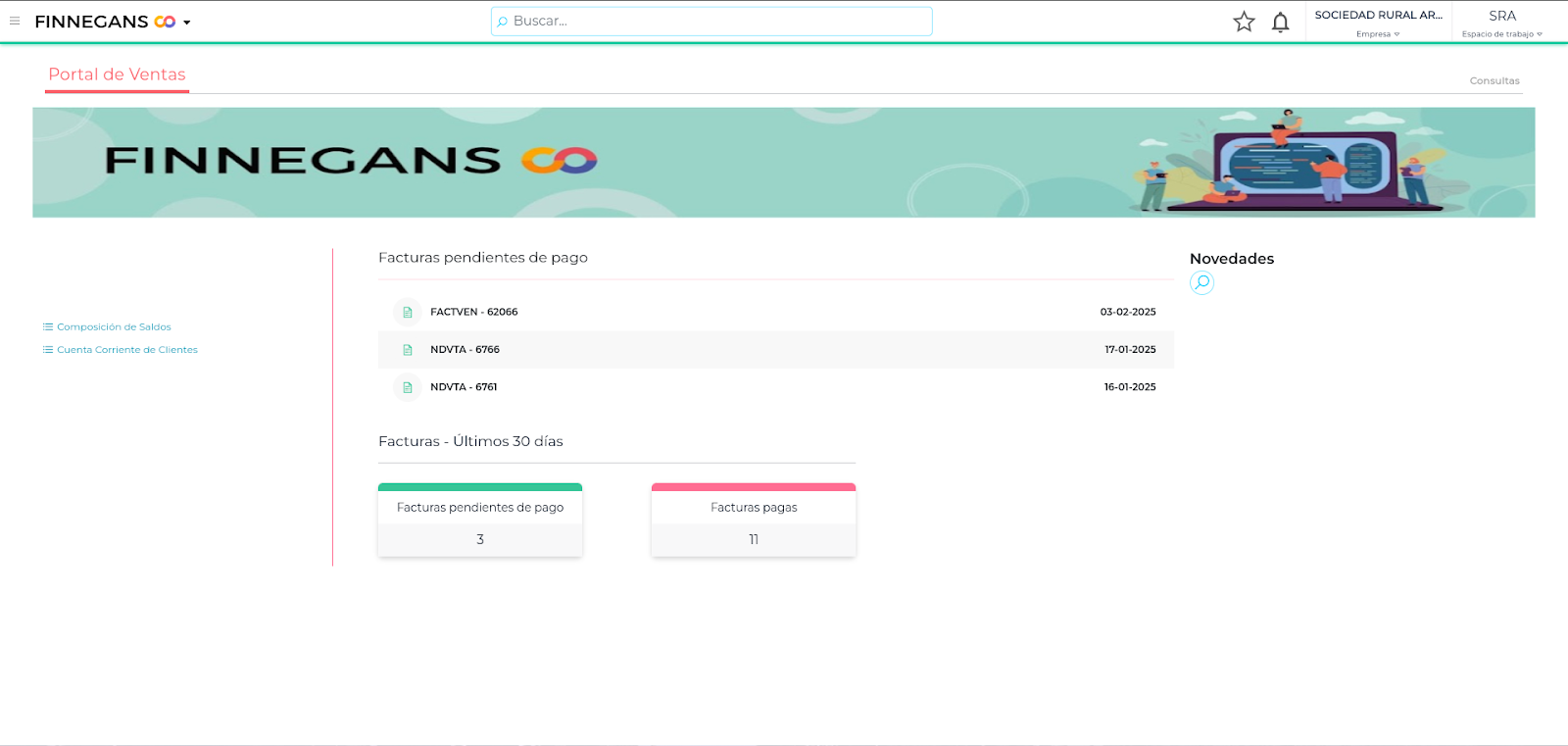 2- Una vez logueado, desde el menú izquierdo podrá observar la aplicación “Portal de Clientes” a la cual fue invitado, y desde el extremo superior derecho la “Empresa” a la cual fue invitado.