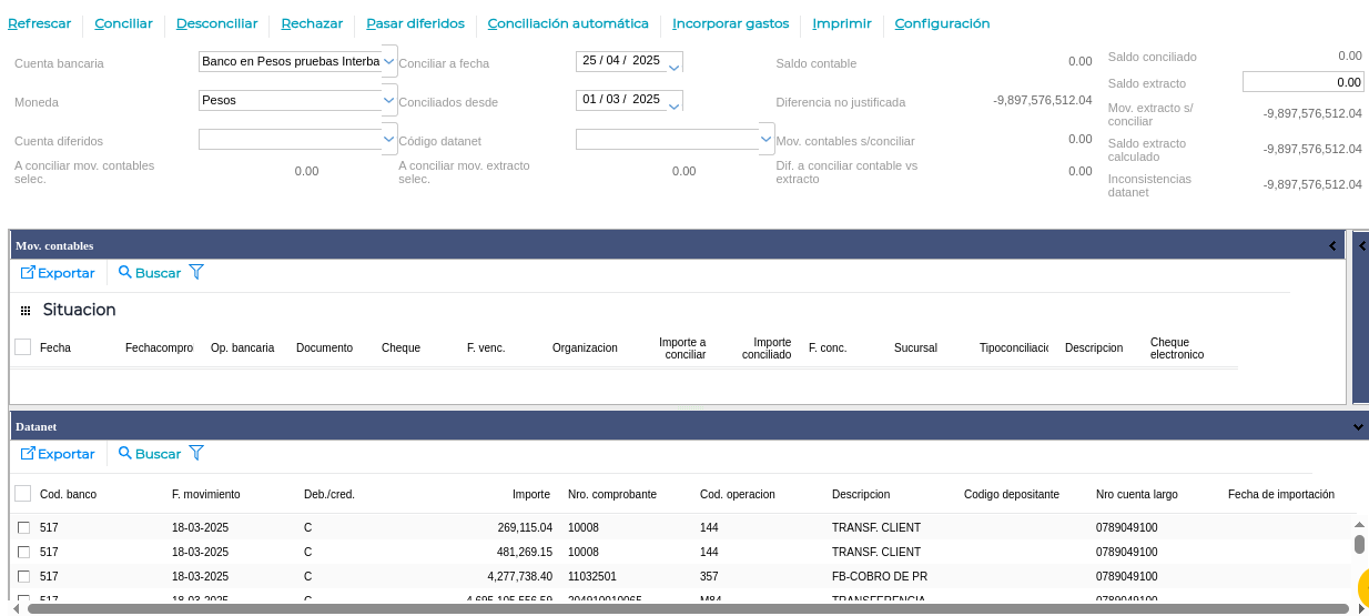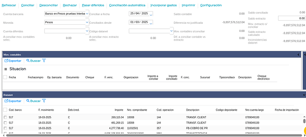 En la sección inferior de la conciliación, llamada “DATANET” se enumeran todos los movimientos que fueron llegando desde la integración y el saldo al cierre en el campo “Saldo Extracto”