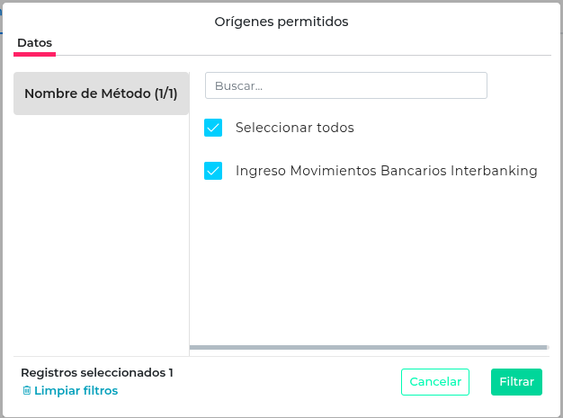 En la solapa “Orígenes Permitidos”, vamos a hacer check en el campo “Seleccionar todos” y presionamos el botón “Filtrar”.