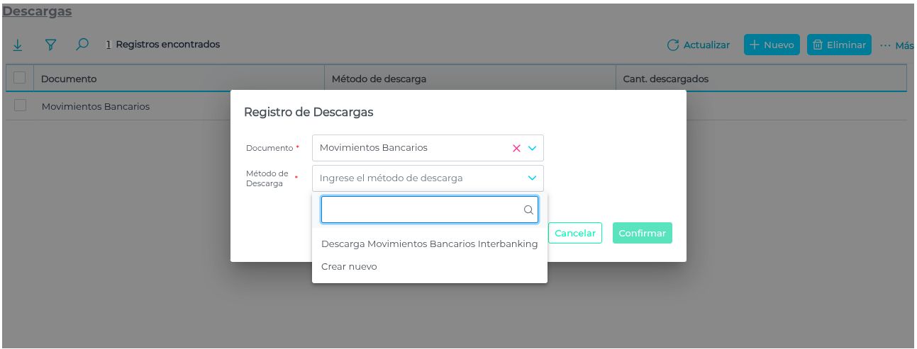 3- Se muestra un POP UP que solicita “Documento” y “Método de Descarga”. En el selector de Documento, buscamos el valor “Movimientos Bancarios”.