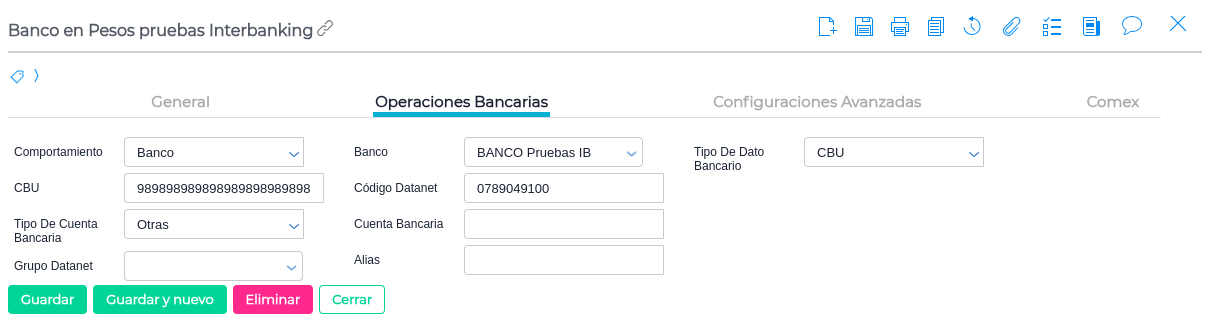 En la edición de la cuenta se debe completar el campo “Código Datanet” dentro de la solapa Operaciones Bancarias. El valor, es el que interbanking usa para identificar la cuenta de banco bajo el nombre “Número de cuenta largo”