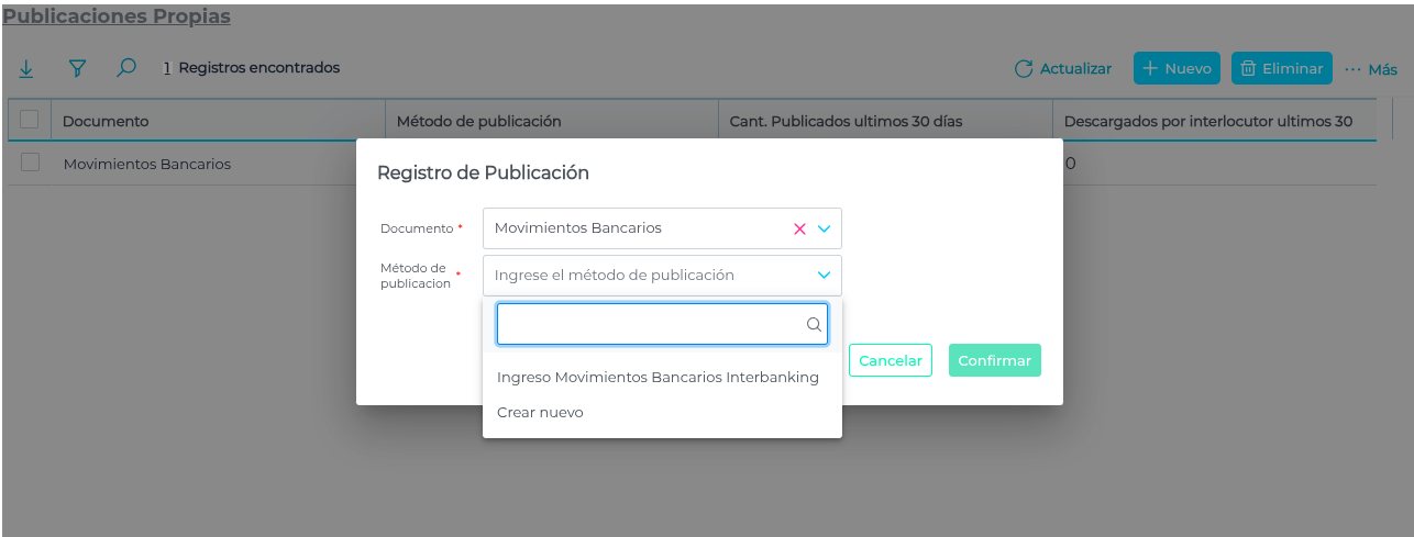 3- Se muestra un POP UP que solicita “Documento” y “Método de Publicación”. En el selector de Documento, buscamos el valor “Movimientos Bancarios”.