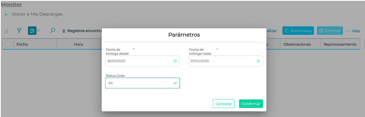 Entonces presionamos el botón “Parámetros” para que se despliegue un pop up donde definimos las fechas desde - hasta y el estado. Luego presionamos el botón confirmar.