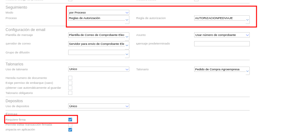 - Configurar el tipo de documento origen con el tilde en Requiere firma y con el “Proceso de autorización que corresponda”