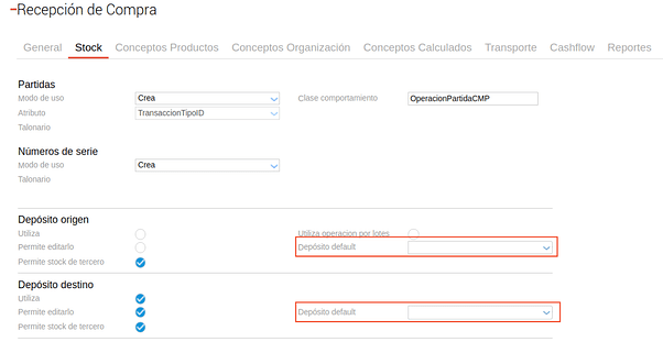 Depósito: corresponde al depósito que va a tomar por default el documento destino. Este campo aplica para los documentos que impactan en stock. Si este campo se encuentra vacío y el documento impacta en stock, el sistema va a tomar el depósito que tengan configurado como default el tipo de documento según corresponda.