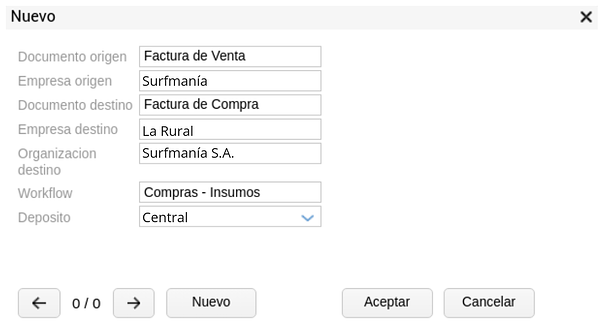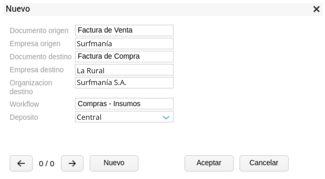 Organización destino: Organización que corresponderá al cliente/proveedor en el documento destino. Será la misma que “empresa origen” pero debe estar cargada en el maestro “Clientes” o “Proveedores” según corresponda.