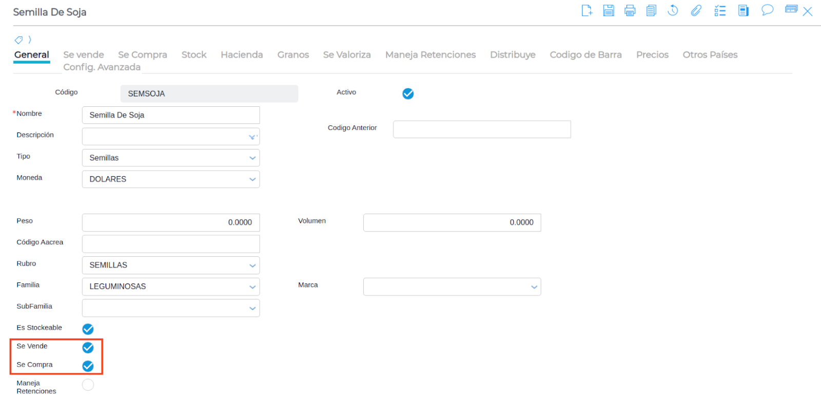 - En la configuración de Maestro de “Productos” se deben tildar los campos de tipo checkbox “Se compra” y “Se vende”.