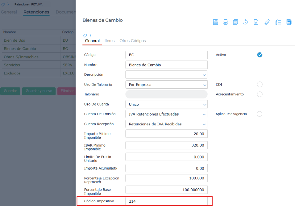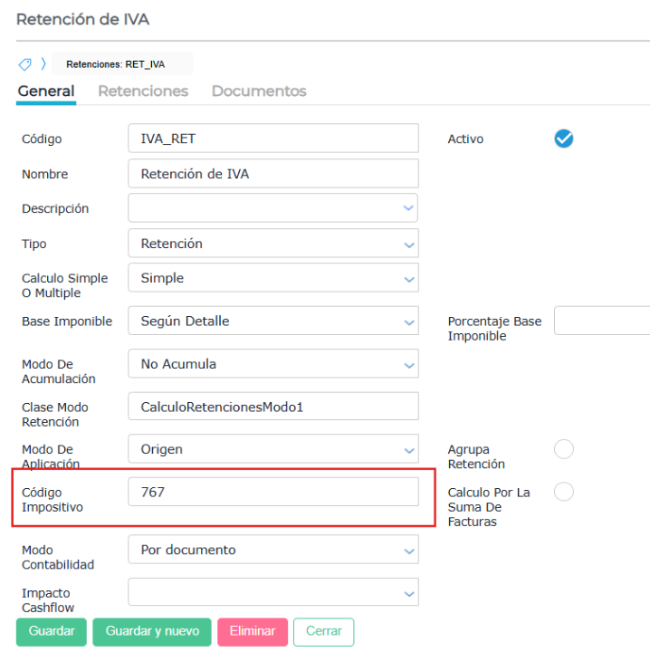 - Impuesto: toma el dato del campo “Código” del tipo de retención. Ejemplo: