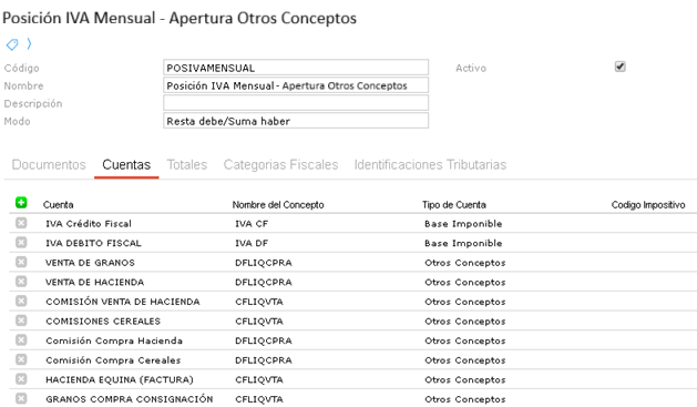 En la solapa “Cuentas” se indican no solo las cuentas de Debito y Crédito fiscal sino también las que van a intervenir en las liquidaciones cuando se traten de transacciones de agro: