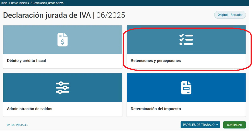 Una vez que presionamos sobre “Continuar”, nos mostrará las opciones para la confección de la DDJJ. En nuestro caso, para realizar la importación de retenciones y percepciones presionaremos sobre el apartado “Retenciones y Percepciones”, permitiéndonos desde ahí realizar la carga correspondiente: