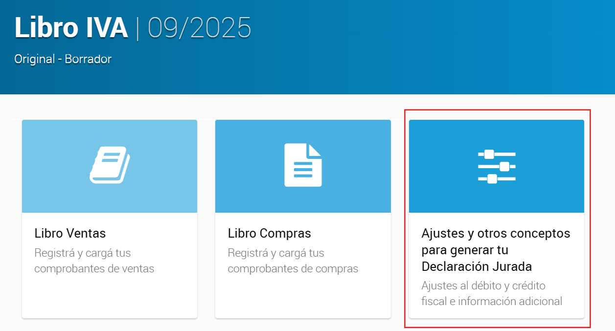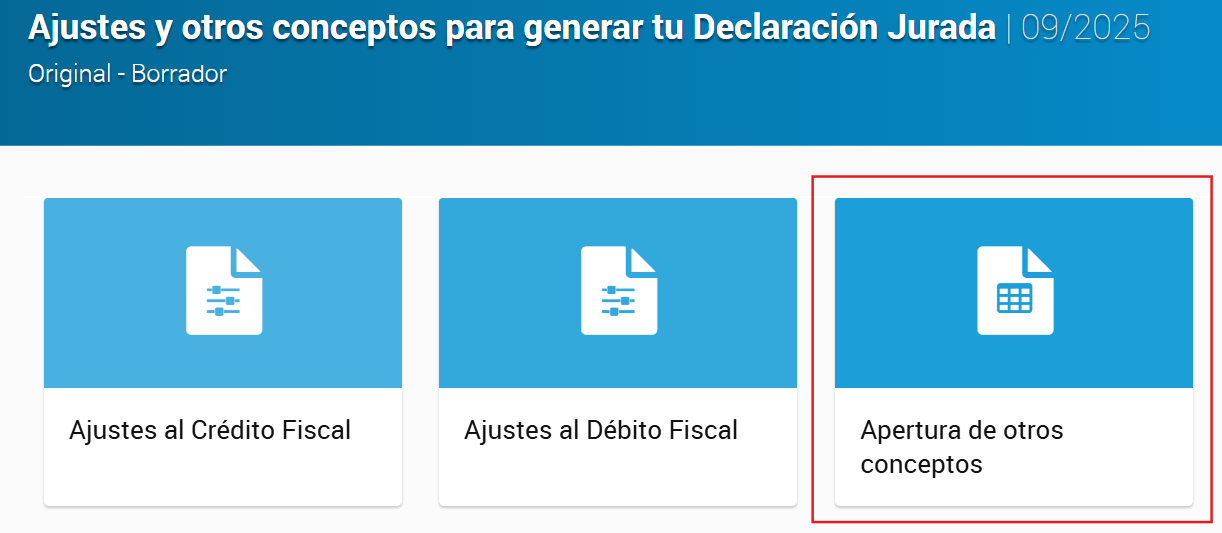 Una vez cargado lo que son el Libro IVA Ventas y Libro IVA Compras, se puede realizar la carga del IVA por actividad. Para esto, debe usarse el módulo llamado “Apertura Otros Conceptos” que se encuentra dentro de “Ajustes y otros conceptos para generar tu Declaración Jurada”.