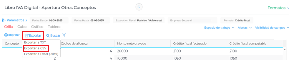 - El informe agrupa por cada venta/compra los ítems diferenciados por actividad, categoría y alícuota.
