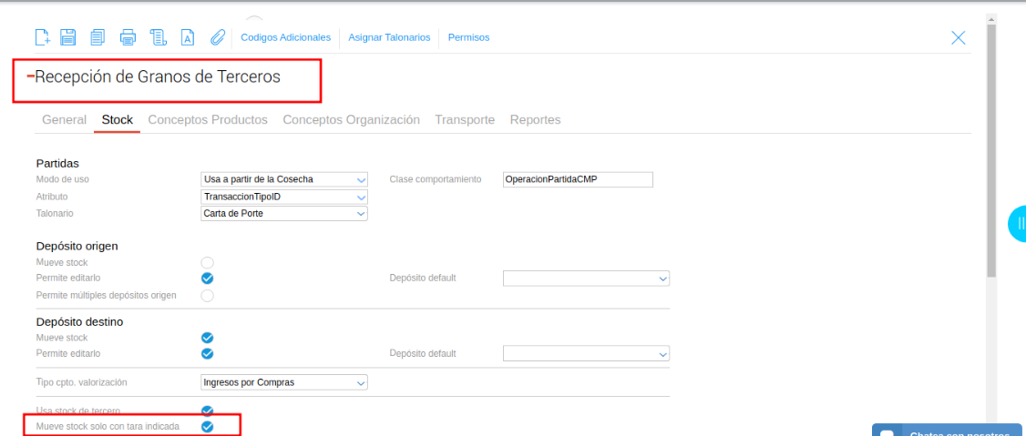 1- Ingresar a Tipo de Documento > Recepción de Granos y controlar si tienen tildado esta opción “Mueve stock solo con tara indicada”.