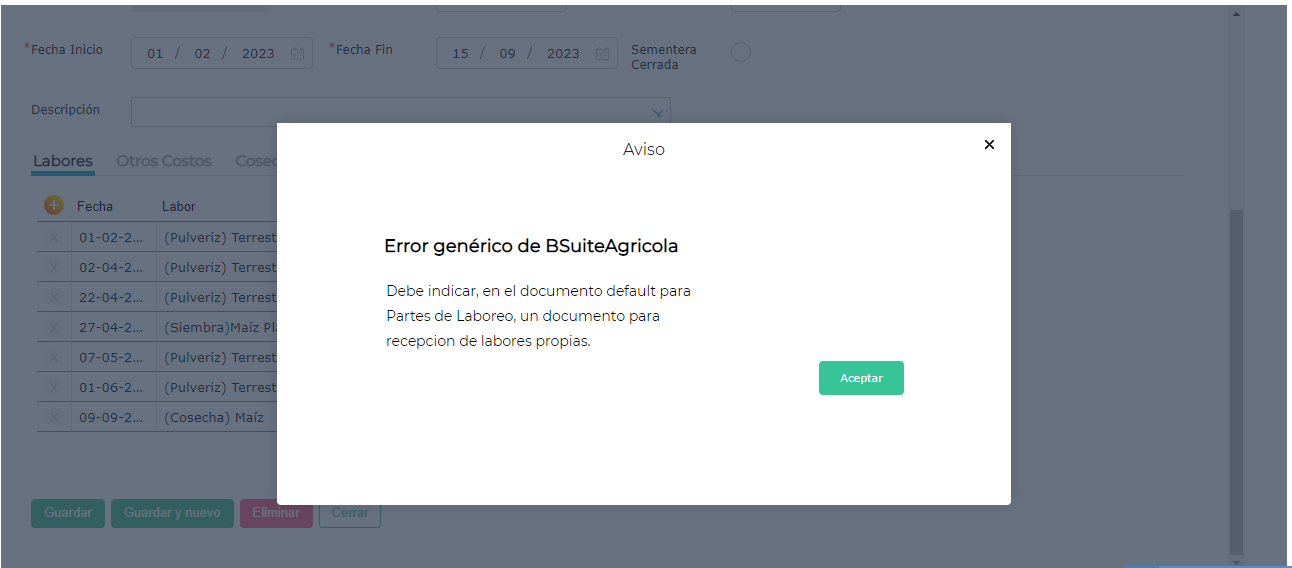 “Debe indicar, en el documento default para Partes de Laboreo, un documento para recepción de labores propias”